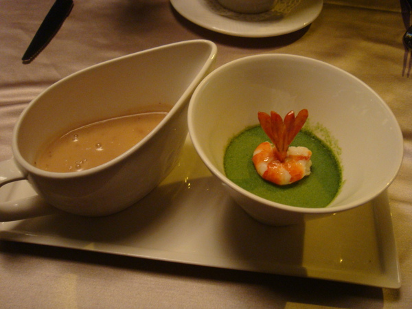 一端上桌分成蕈菇濃湯跟芙蓉鮮蝦2碗