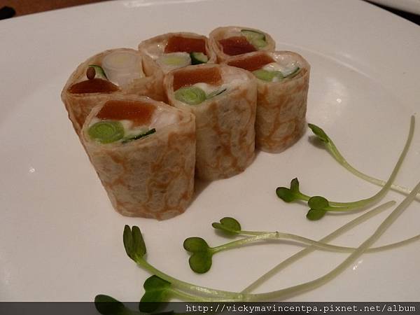 很有巧思的將烏魚子 蒜苗 小黃瓜 再加上美乃滋一起卷在蛋捲裡