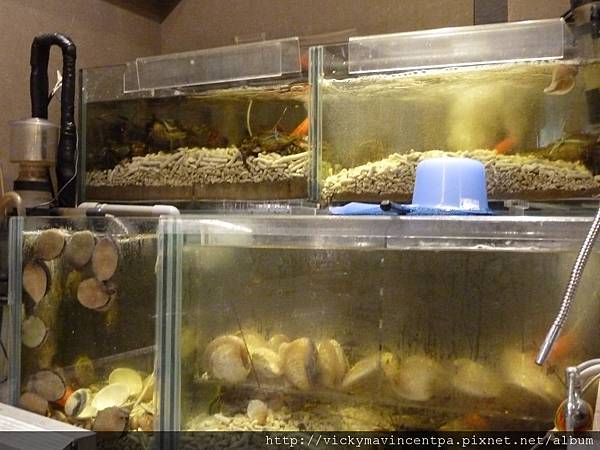 吧台內水族箱裡的生猛海鮮們