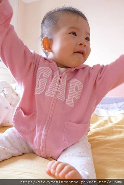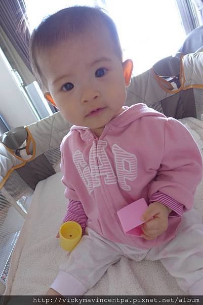 4/24 小蘇菲扶著遊戲床的邊緣站起來了耶 而且撐了好久呀 看來會走的日子近了