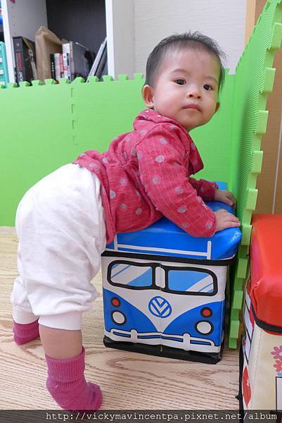 4/4 這兩天開始會攀著小整理箱站起來囉 看來這整理箱圍牆快關不住小蘇菲喏...