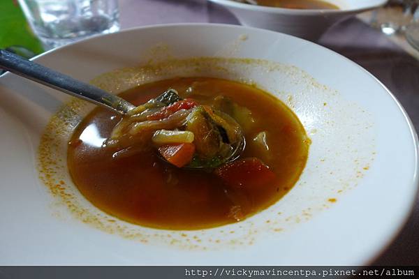 義式番茄蔬菜湯頗鮮甜 盤底滿是青菜蘿蔔哩!!